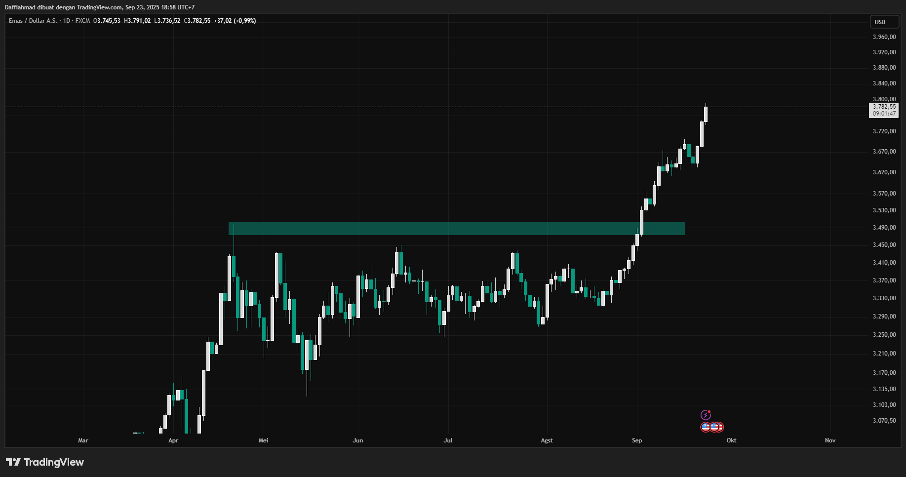 As of today, Tuesday, September 23, 2025, the price of gold is once again showing a brilliant performance with a significant increase. Antam gold bars, one of the most popular investment instruments in Indonesia, recorded a surge of Rp 41,000 per gram to Rp 2,164,000.00 per gram. This drastic increase has pushed the price of gold to an all-time high (ATH). This robust domestic price rally is a direct reflection of a powerful upward trend in the global market.