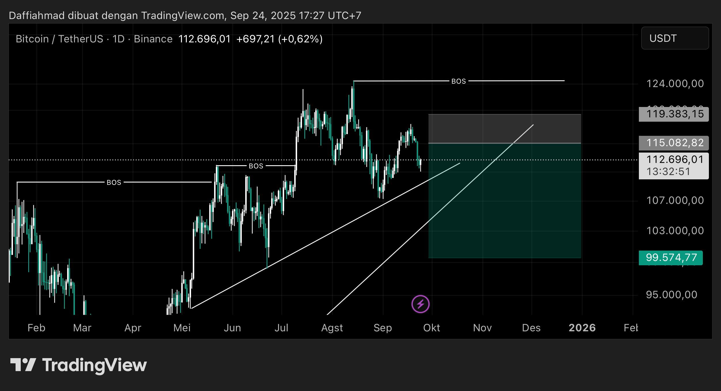 Several BOS marks confirm bullish structure from May to August. However, the last BOS at $119,000 hasn’t been reclaimed after a pullback, signaling fading momentum.