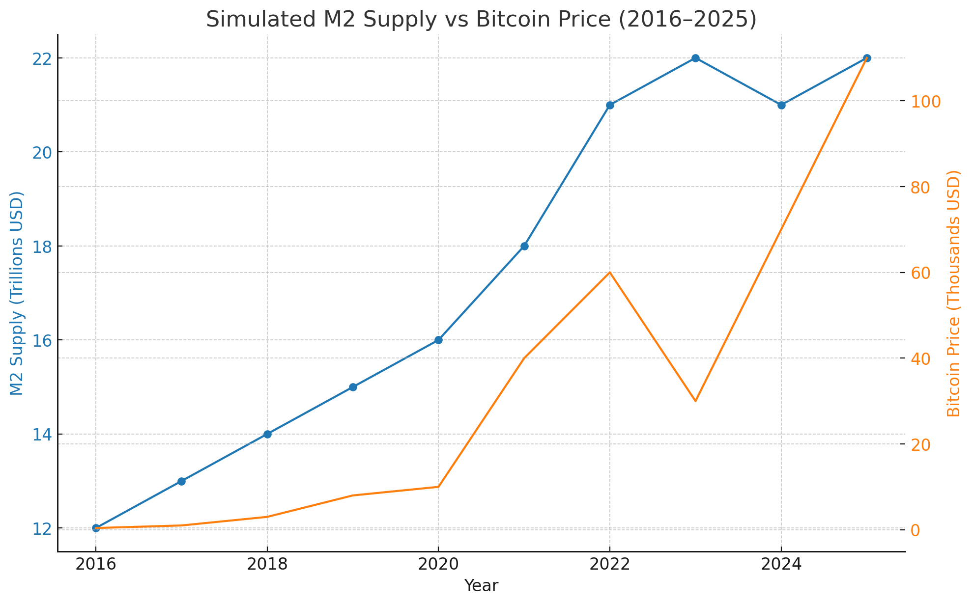 • Steady Growth Pre-2020: M2 grew gradually, and Bitcoin had cyclical bull runs tied to halving events and liquidity cycles.